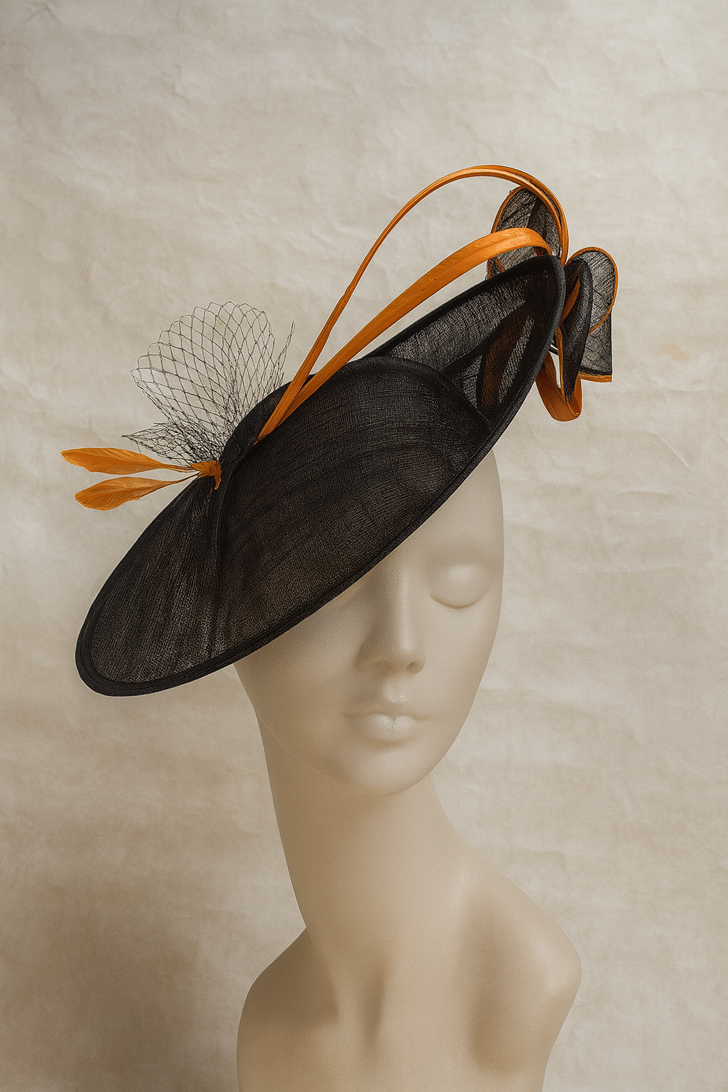 Sisal noir avec détails orange. Voilette légère et plumes. Très chic.