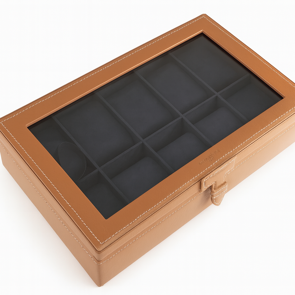 Coffret 12 montres en cuir recyclé camel, couvercle vitré, finition signature Le Tanneur.
