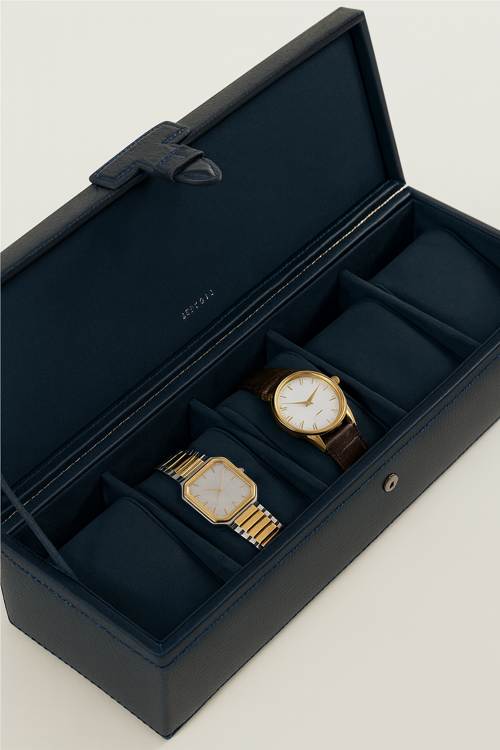 Coffret 5 montres bleu, cuir recyclé, velours crépuscule, fermoir signature.