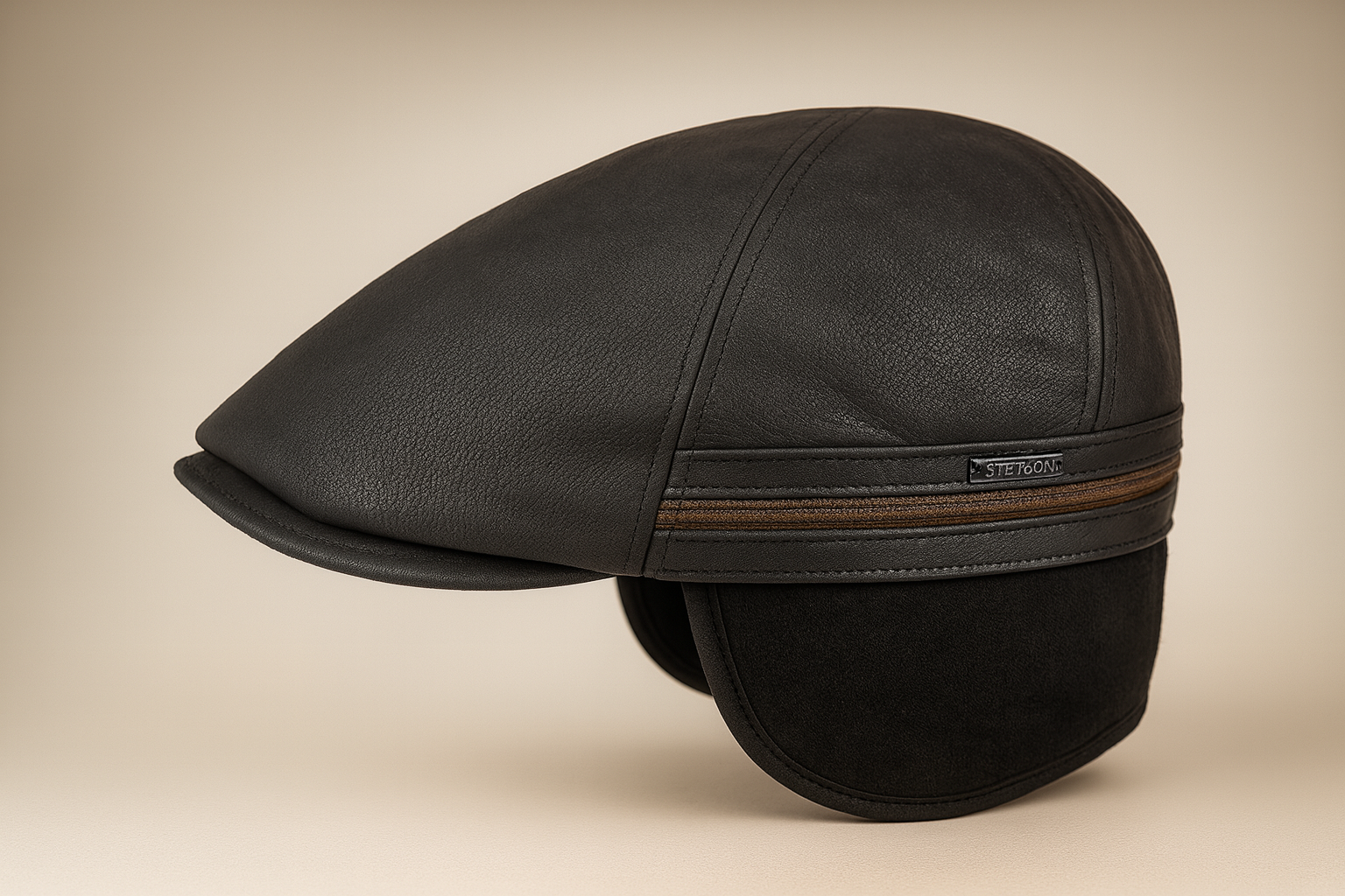 Casquette bec-de-canard en cuir marron et tissu, avec cache-oreilles doublés, style aviateur rétro pour l’hiver.